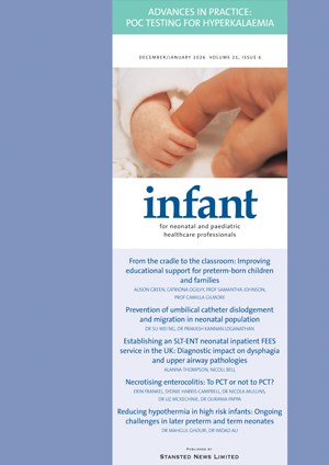 Infant journal is the leading UK publication for the multidisciplinary team that cares for vulnerable sick or premature babies in their first year of life. Published bi-monthly, the journal contains authoritative articles with a clinical or practical bias written by experts in their field.