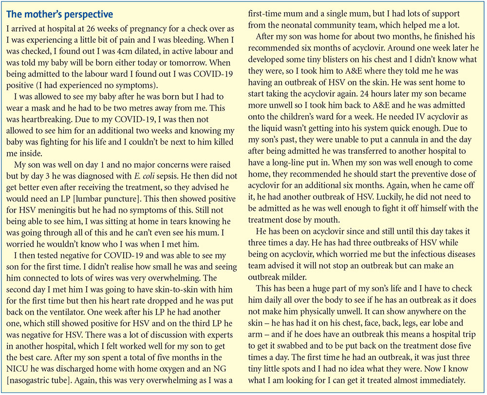 In this article, we describe a case of neonatal herpes simplex virus infection with CNS involvement in an extremely premature infant delivered to a COVID-19 positive mother who had no history or symptoms of genital herpes infection. The infant completed a planned six-month course of acyclovir treatment and then prophylaxis but following discontinuation, he developed skin symptoms. Prophylaxis was resumed and continues at 24 months of age with several subsequent skin outbreaks. The difficulties from the mother’s perspective are also presented.