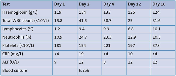 TABLE 1 Results of investigations carried out on days 1 to 16 of life. Key: WBC=white blood cell; CRP= C-reactive protein; ALT= alanine transaminase.
