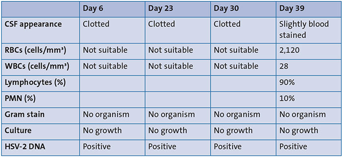 TABLE 2 CSF findings from lumbar punctures on days 6 to 39. Key: CSF=cerebrospinal fluid; RBC=red blood cell; PMN=polymorphonuclear leukocyte (polymorph).