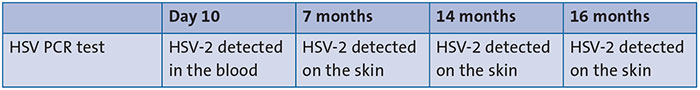 On day 6, the baby was felt to be clinically stable enough for a lumbar puncture in light of the E coli sepsis. His cerebrospinal fluid (CSF) was clotted and unexpectedly HSV-2 was detected in the CSF by a polymerase chain reaction (PCR) test, which is routinely performed on neonatal CSF in our trust. Consequently, intravenous (IV) administration of acyclovir was commenced. A PCR test on blood was positive for HSV-2 on day 10 of life. As per the tertiary paediatric infectious disease (PID) team advice to determine length of treatment, lumbar punctures were repeated on day 23 and day 30 of life (TABLE 2). HSV-2 was persistently detected and therefore IV acyclovir treatment was continued.