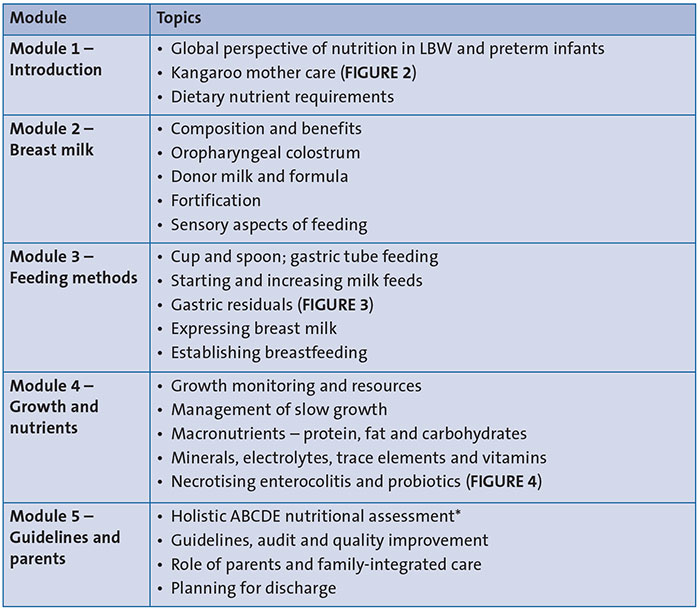 The African Neonatal Nutrition Network (NeoNuNet) has developed an online eLearning course on feeding and nutrition that aligns with the World Health Organization policy and guidelines. It provides free educational resources relevant to nurses, dietitians, doctors, and other healthcare professionals working on a neonatal unit as well as parents. It covers a range of subjects including kangaroo mother care, breastfeeding, nutrient recommendations, probiotics, feeding practice and guideline development. The course was co-developed (TABLE 1) with clinicians based in Africa and while it is aimed at middle and low income settings in Africa, Asia and Latin America, it is equally relevant in high income settings in the UK, Europe and North America.