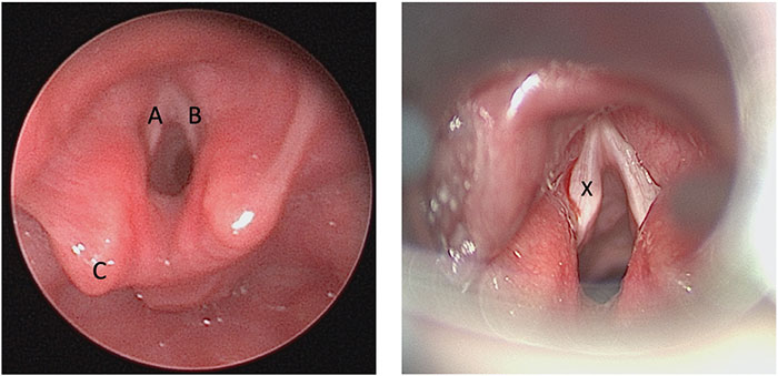 FIGURE 1 Endoscopic images of the larynx of an ex-preterm born at 26 weeks’ gestation with left vocal cord paralysis after PDA ligation. Left: Pre-operative image showing A = left vocal cord, B = right vocal cord and C = left arytenoid. Notice the prolapsed left arytenoid due to palsy. Right: Left vocal cord augmentation with hyaluronic acid, X = site of hyaluronic acid.