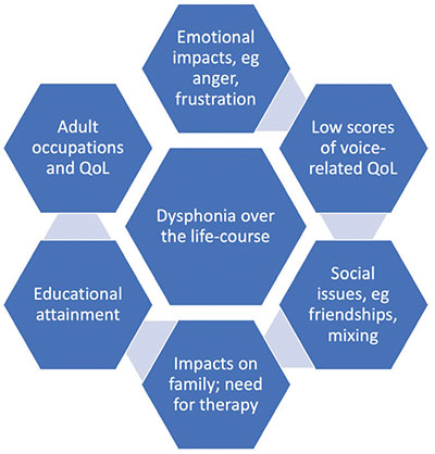 HRQoL is a broad multi-dimensional concept that includes the patients’ subjective evaluation of both positive and negative aspects of life, which includes physical, mental, emotional and social domains. Voice-related QoL was assessed using qualitative analysis to identify themes in children of different ages with dysphonia. Young children expressed issues related to physical function including ‘run out of air’ or ‘sometimes voice doesn’t work’.23 90% of the children reported that they had been repeatedly asked to use a quieter voice in school, which probably had a negative impact on their education. Older children and adolescents said their dysphonic voice received undue attention and limited their participation in important events – they felt they ‘missed out’. Adolescents were sometimes afraid or hesitant to speak; they worried about ‘sounding dumb’, reported being teased by other children and many were asked to ‘speak up’. Many said they felt they were left out of activities or felt isolated.23 They also expressed anger, sadness and frustration. Dysphonia may also impact on educational performance and occupational choices,4,24 and many parents perceived poor long-term voice quality as an important ongoing issue (FIGURE 2).1