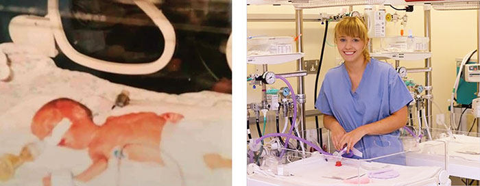 Sophie Proud as a preterm baby and now a neonatal junior sister.