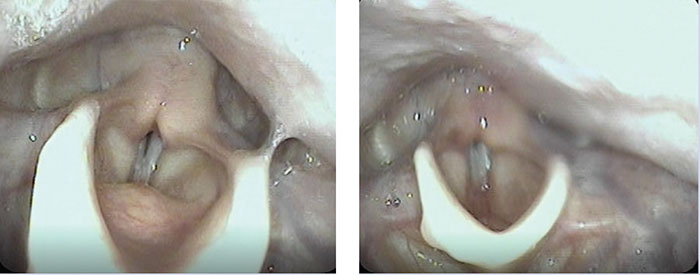 FIGURE 3 Sophie’s glottal closure disorder before (left) and after (right) hyaluronic acid treatment. The gap has closed but the quality of her voice did not improve.