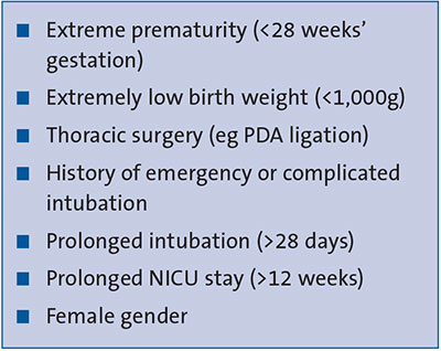 In a case series of 20 children born at 23-29 weeks’ gestation with vocal problems, most (14 out of 20) had a posterior glottic chink with a mild degree of supraglottic hyperfunction (‘squeeze’). Several children had evidence of arytenoid prolapse or vocal cord immobility. Rarer findings included posterior scar band, vocal cord atrophy, arytenoid oedema and nodules. One child with structural laryngeal pathology had never been intubated.7,8