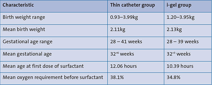 A total of 39 babies had surfactant administration using a thin catheter with a total of 46 procedures, while 31 babies had surfactant administration via i-gel with a total of 36 procedures. Seven babies required a repeat dose of surfactant in the thin catheter group whereas five babies had a repeat dose of surfactant via i-gel. The dose of surfactant given was based on body weight and was similar in both groups, as per the unit protocol.