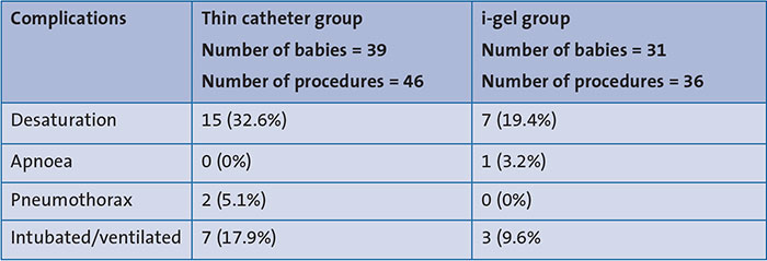 A comparison of the complications of the two procedures can be seen in TABLE 2. Desaturation occurred more frequently in the catheter group than the i-gel group. One baby in the i-gel group experienced apnoea; two babies in the catheter group experienced pneumothorax.