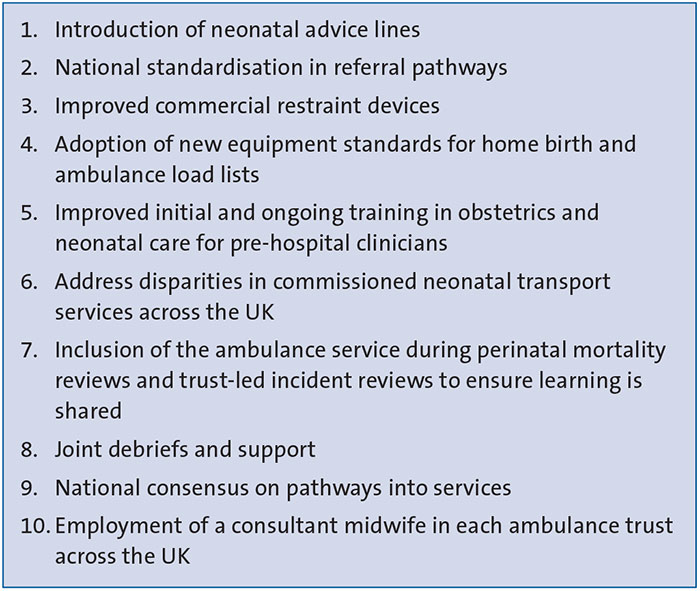 The funding and commissioning of neonatal transport teams is currently limited to the transfer of neonates into or out of a neonatal unit. There is no capacity or provision to respond to neonates born in the community setting, or for the support of the transfer of pregnant women between hospital facilities. The responsibility for the transport of these cases lies with the ambulance service and while it is unrealistic to expect the training of staff and the equipment available to equal that of transport teams, there are areas for improvement.