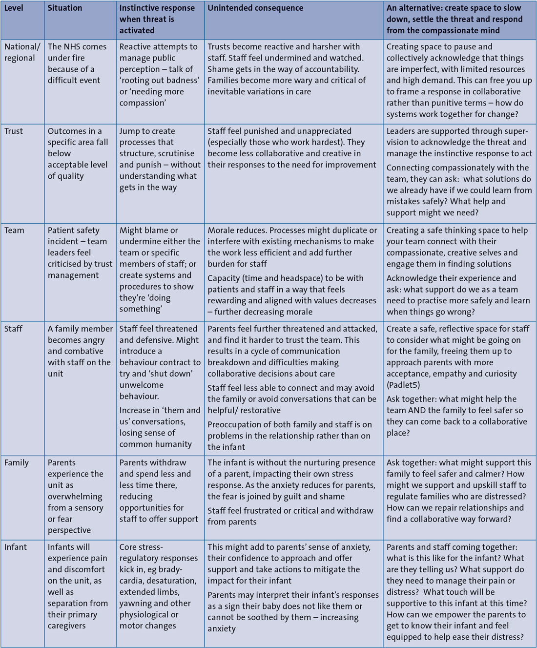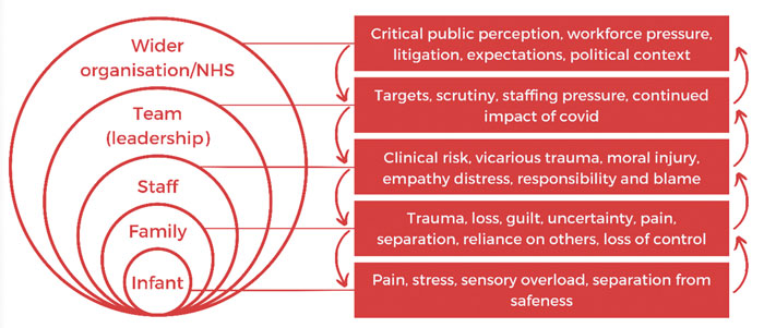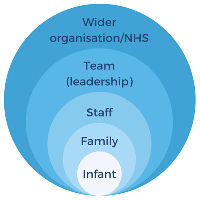 Maternity and neonatal services provide care for families at a hugely important point in their lives. Infants and their families are cared for with great skill and expertise. At the same time, threat – including uncertainty, change, risk or loss – pervades the perinatal period.2 This threat is amplified for infants, families, staff and organisations by many situations (feared/imagined and actual). For example, when: