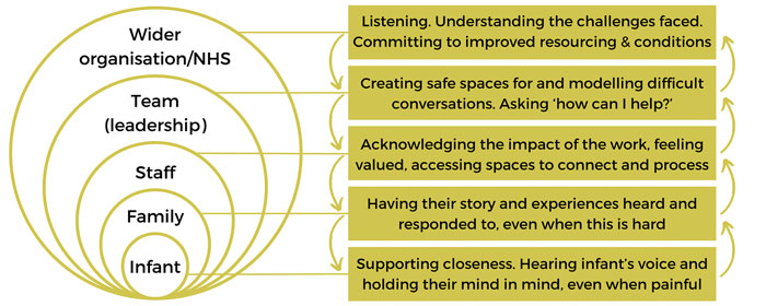 When the organisation nurtures a psychologically safe environment for staff, those staff feel more contained, which reciprocally allows them to work in collaborative and prosocial ways, contributing to that psychologically safe environment. Similarly, staff who are experiencing soothing and safeness are better able to provide care that is compassionate, meaning families feel safer and more contained, contributing to collaborative relationships with the staff team.
