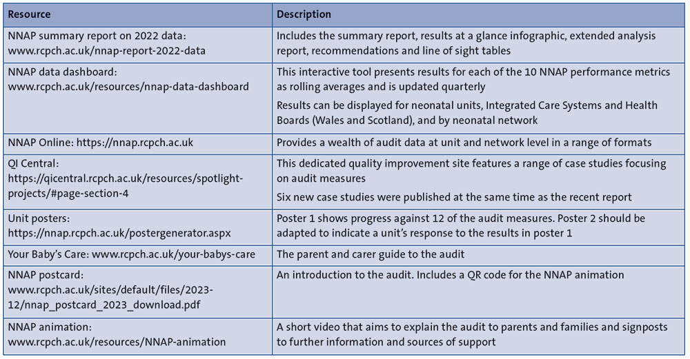 The NNAP1 is commissioned by the Healthcare Quality Improvement Partnership (HQIP) and delivered by the Royal College of Paediatrics and Child Health (RCPCH). The summary report on 2022 data was published in October 2023 (FIGURE 1).2 The report summarises the key messages and national recommendations developed by consensus by the NNAP Project Board and Methodology and Dataset Group, based on NNAP data relating broadly to babies discharged from neonatal care in England and Wales between January and December 2022, and Scotland between 1 April 2022 and 31 December 2022.