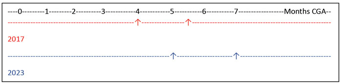TABLE 1 Differences between 2017 and 2023 Bliss guidance. Key: CGA=corrected gestational age.