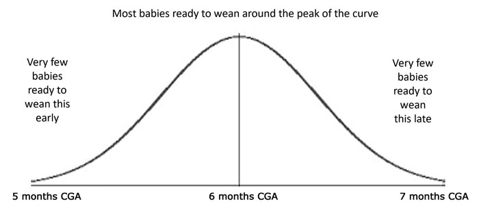 FIGURE 2 Bell-shaped curve indicating numbers of babies likely to be ready for weaning within the suggested window of 5-7 months CGA.