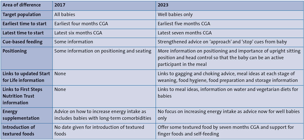 The weaning process, also known as introduction of complementary foods, is much more than just a change in the type of food a baby takes to obtain nutrition. It also has social, developmental, psychological, physical and medical connotations. Food and meals are the centre of many celebrations and often define cultural identity. Therefore, guiding parents to help their babies build a healthy and pleasurable relationship with food and eating is a key objective during weaning, and this can be aided by having comprehensive and unified guidelines. Such weaning publications have been provided by Bliss (a national independent parent support organisation) since 2002. The most recent update of the Bliss preterm weaning guidance features some adjusted recommendations;1 this article provides a summary of the history of Bliss weaning recommendations to date and provides an insight into the rationale for the adjusted recommendations.