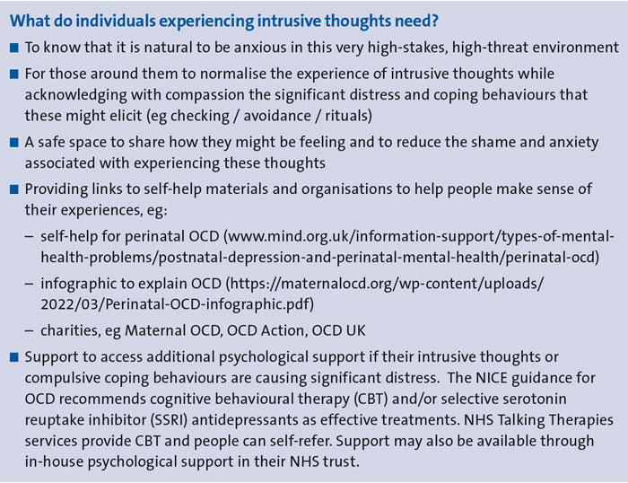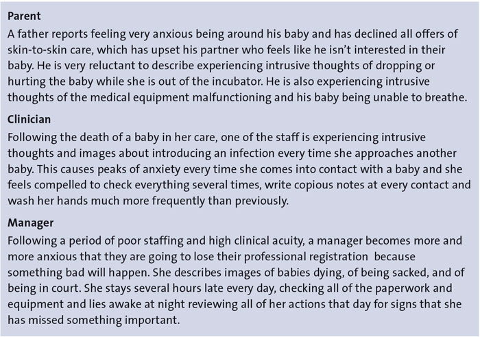 It is not only parents who are exposed to increased levels of threat in the neonatal context. Neonatal care is a high-risk, high-stakes environment where outcomes are often uncertain. Staff are under increased scrutiny in the context of a range of high-profile court cases and a culture of fear and shame is often pervasive.4,8 We know that some healthcare professionals are, by the nature of their work, more vulnerable to intrusive thoughts (see below), and it is unsurprising that we are hearing anecdotal reports of an increased experience of these on neonatal units.
