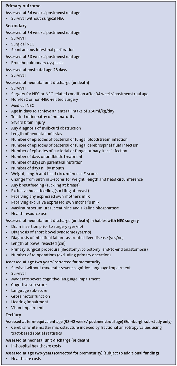 The primary outcome is survival to 34 weeks’ postmenstrual age without necrotising enterocolitis (NEC) surgery. The extensive list of secondary outcomes includes language and cognitive development at two years old, metabolic bone disease, growth and all core neonatal outcomes.1 All outcomes are summarised in TABLE 2.